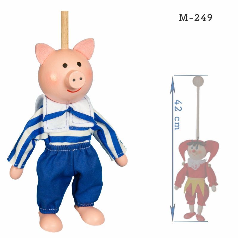 三匹の子ブタはリボンの色が違います。マリオネットはチェコを代表する工芸品です。あやつり糸はなく、ポールを持って小さいお子様でも簡単に遊ぶことができます。